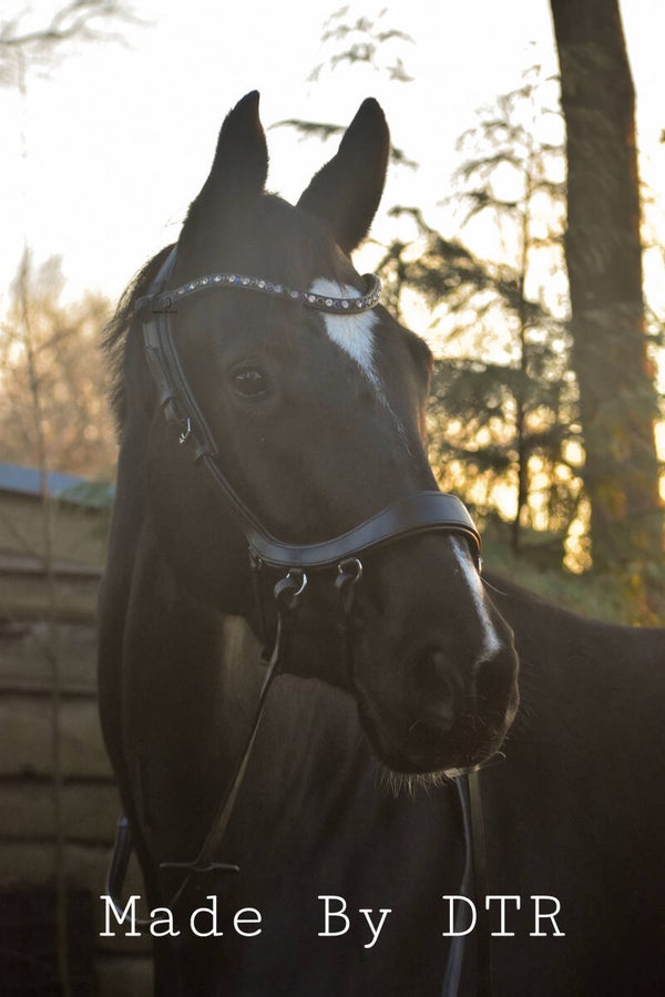 Het paard op de foto is 172cm en draagt de frontriemen in zwart lak/full/drukknoop/diepe wave/leren achterkant met de steentjes in de kleuren L03/L05/L06 & zwart/full/PresTeq/wave/leren achterkant.